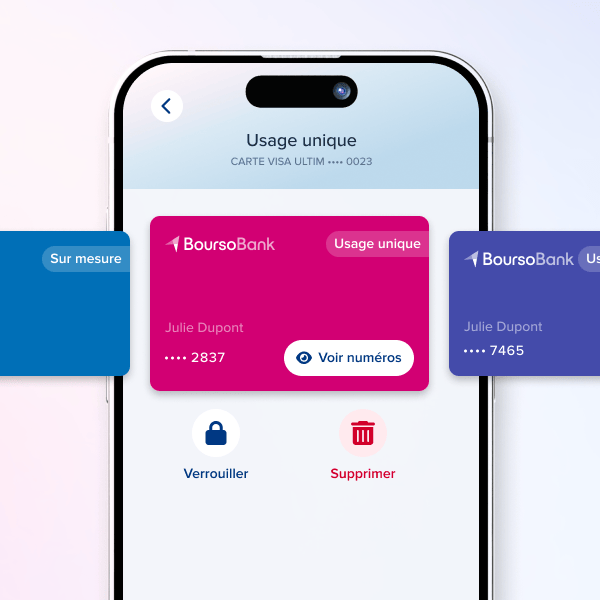 Rendez-vous sur votre application BoursoBank dès maintenant pour créer des cartes virtuelles adaptées à votre besoin : un ou plusieurs paiements, un abonnement, l'enregistrement d'une carte sur un site pour payer plus rapidement...